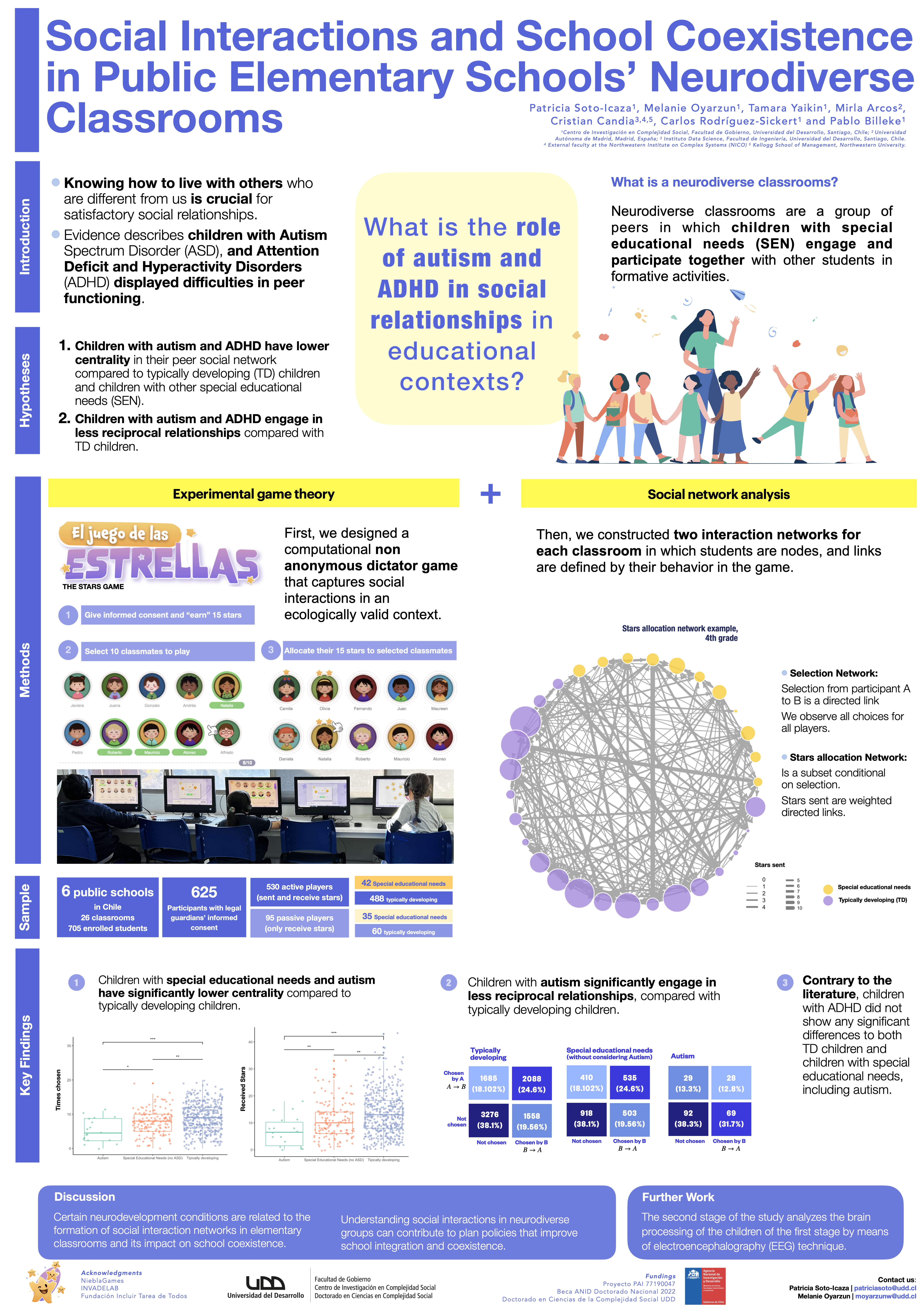 Construimos redes sociales para cada sala de clase a partir de las elecciones hechas por los niños durante un juego distributivo jugado en tablets con una interfaz amigable. Participaron seis escuelas básicas y 625 estudiantes de entre 6 y 11 años. Entre ellos, 464 no tenían necesidades educativas especiales, 143 tenían necesidades educativas especiales distintas del autismo y 18 eran estudiantes autistas.